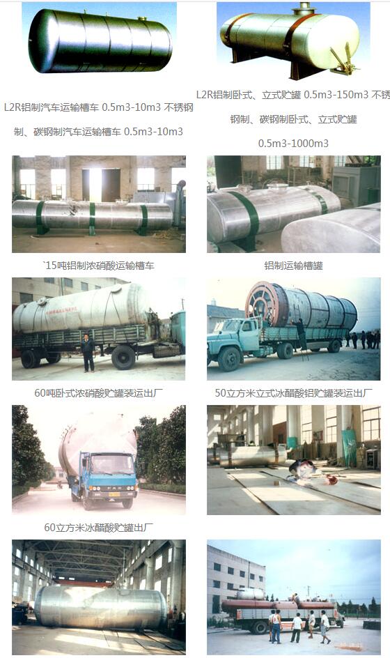 工業純鋁板制汽車運輸槽車、臥式、立式貯罐、高位槽。(主要用于貯運濃硝酸、冰醋酸等腐蝕液體)不銹鋼、碳鋼制各種汽車運輸槽車,臥式、立式貯槽,高位槽計量槽。其他規格可按用戶需求設計、制造。